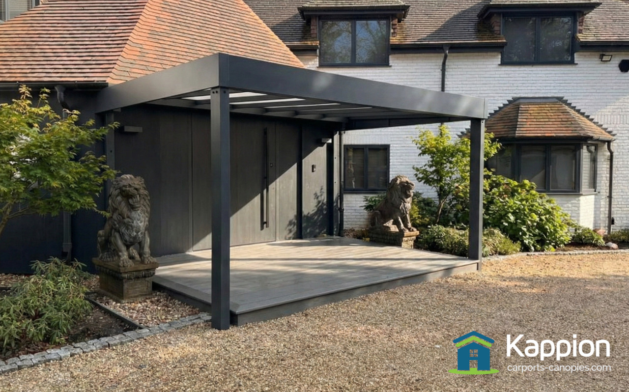 This elegant Jet Black half-curve canopy in Kent provides premium double-car protection from tree sap and bird droppings, featuring contemporary thermo wood detailing and a seamless installation that looks as if it grew right out of the driveway.