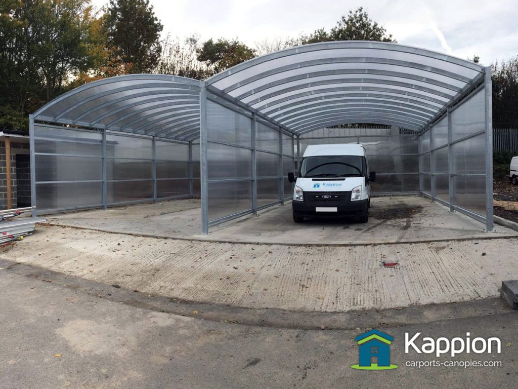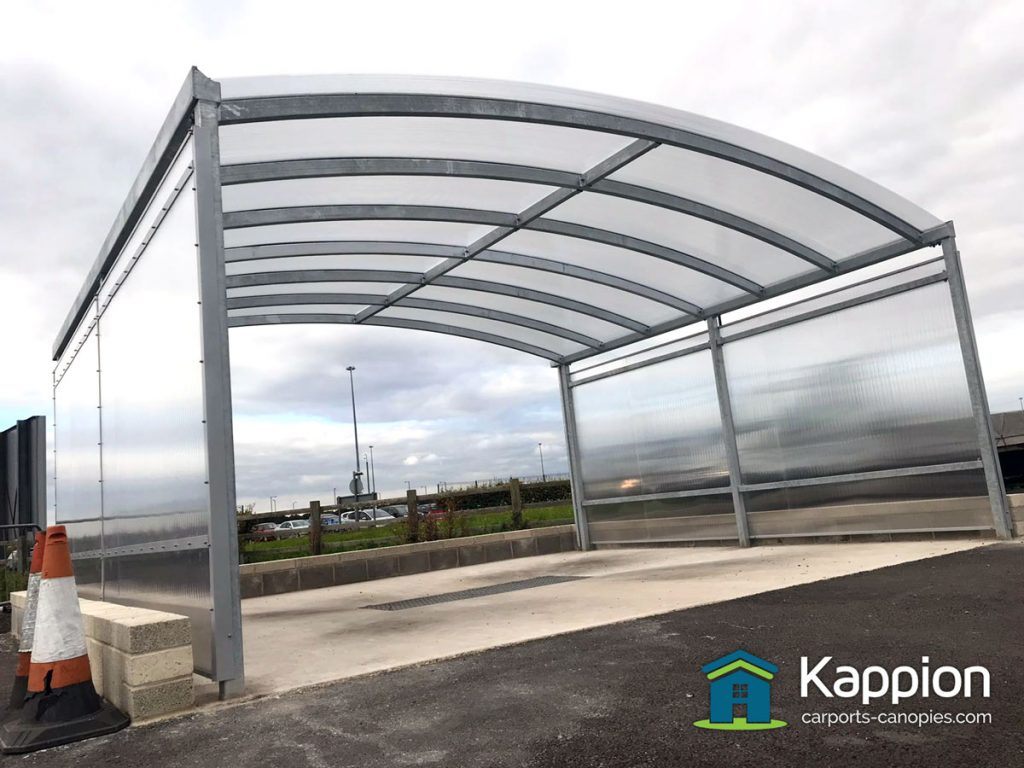When you commission a car valet canopy installation through Kappion Canopies you can be reassured that it will be custom designed and structurally engineered to work with your geographic location. It will be designed to withstand the snow loads and wind speeds for your area. The canopies installed are made from steel for ultimate strength and resilience. They are hot dip galvanised for complete rust protection. Once galvanised the canopy will be powder coated to your chosen RAL colour. The roof will be glazed with your colour choice of long lasting 10mm multiwall polycarbonate. Finally, guttering and downpipes will be designed to meet your exact requirements, which will allow water to be directed to the nearest surface drain, keeping the area dry.
