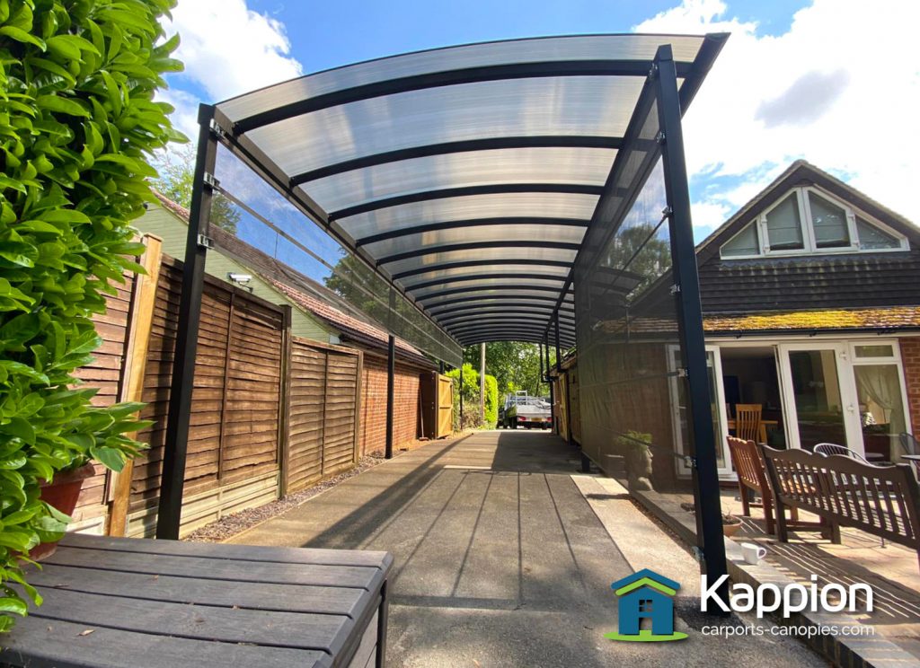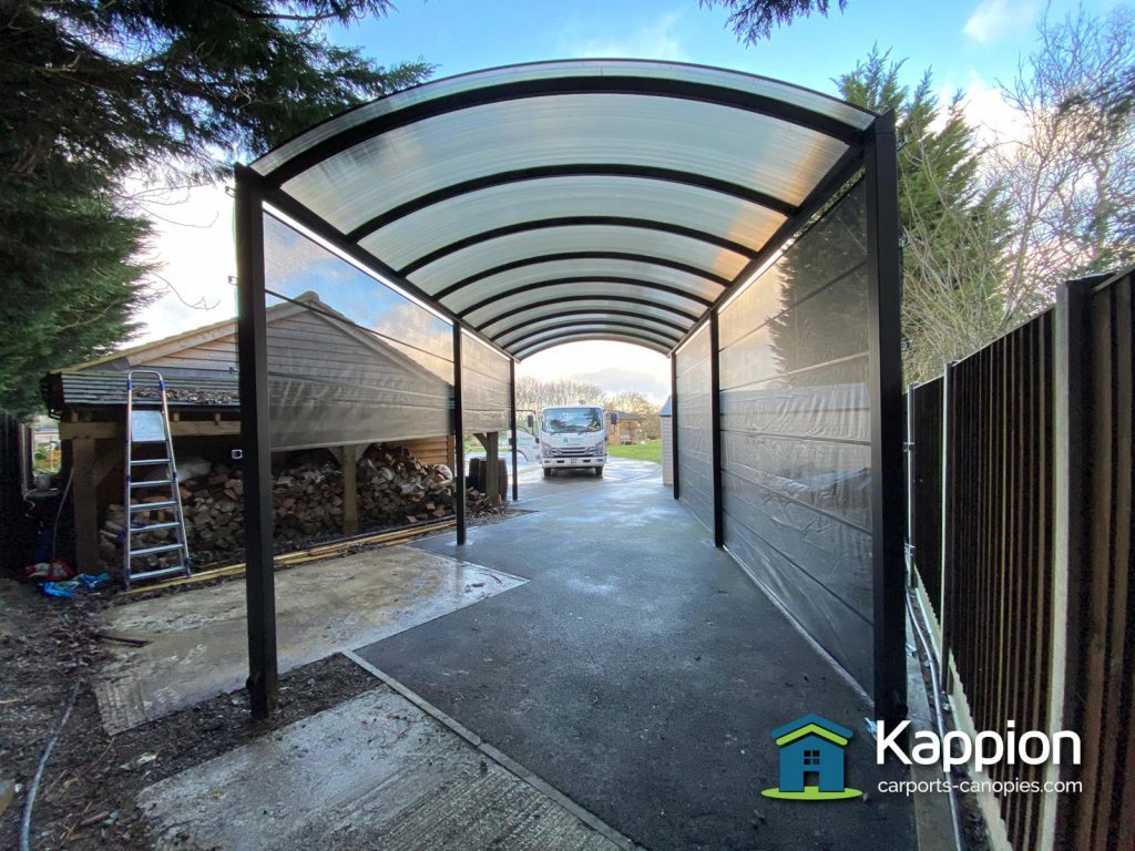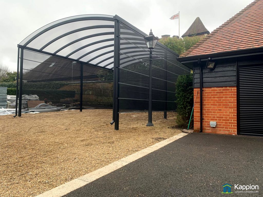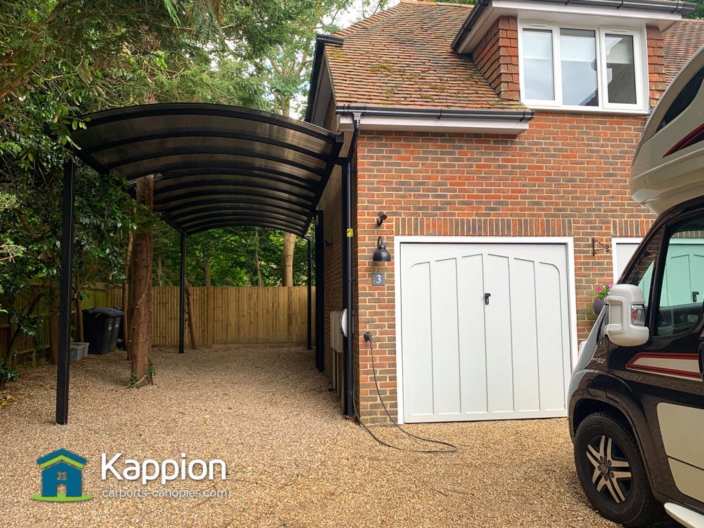 When you commission a motorhome canopy installation with Kappion Canopies you can be reassured that it will be custom designed and structurally engineered to work with your geographic location. It will be designed to withstand the snow loads and wind speeds for your area. The canopies we install are made from steel for ultimate strength and resilience. They are hot dip galvanised for complete rust protection. Once galvanised the canopy will be powder coated to your chosen RAL colour. The roof will be glazed with your colour choice of long lasting 10mm multiwall polycarbonate, which includes a protective UV layer on the top. Finally, guttering and downpipes will be designed to meet your exact requirements, which will allow water to be directed to the nearest surface drain, keeping the area dry.